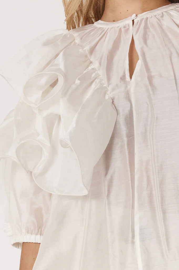 The Celeste Ruffled Blouse exudes effortless femininity. Designed with asymmetrical ruffles, a keyhole neckline and elasticated sleeves, it strikes a balance between structure and softness. Refined and romantic, it transitions seamlessly from day to night.