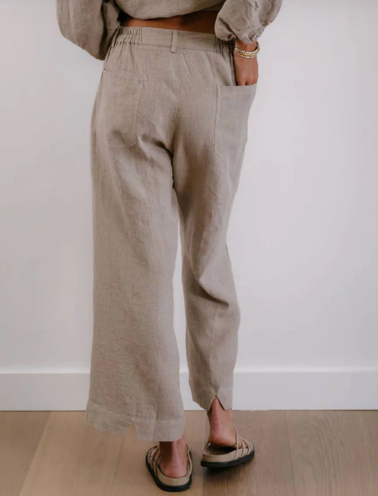The Tess Pant in natural is a 7/8 linen pant crafted from 100% linen.