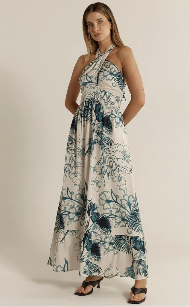 The Solstice Palms Halter Dress captures modern femininity with a sense of ease. Defined by its gathered waist, tiered detailing and halter neckline, it falls gracefully to a maxi length. The shirred back ensures a flattering fit. Effortless elegance for any occasion.