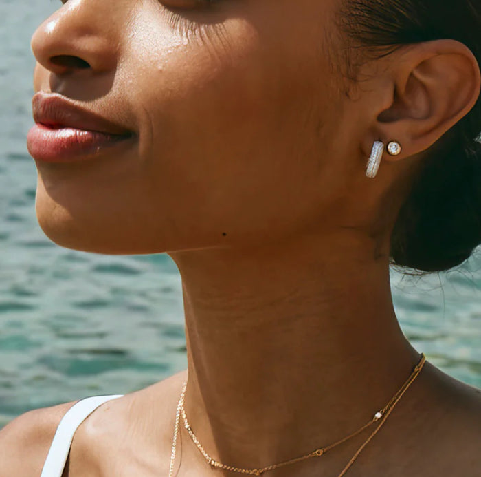 Discover versatile elegance with the Reversible Hoops. Designed for effortless style, these hoops feature a unique reversible design that lets you switch up your look in seconds—pave white crystals in the front and a twisted croissant style on the back.