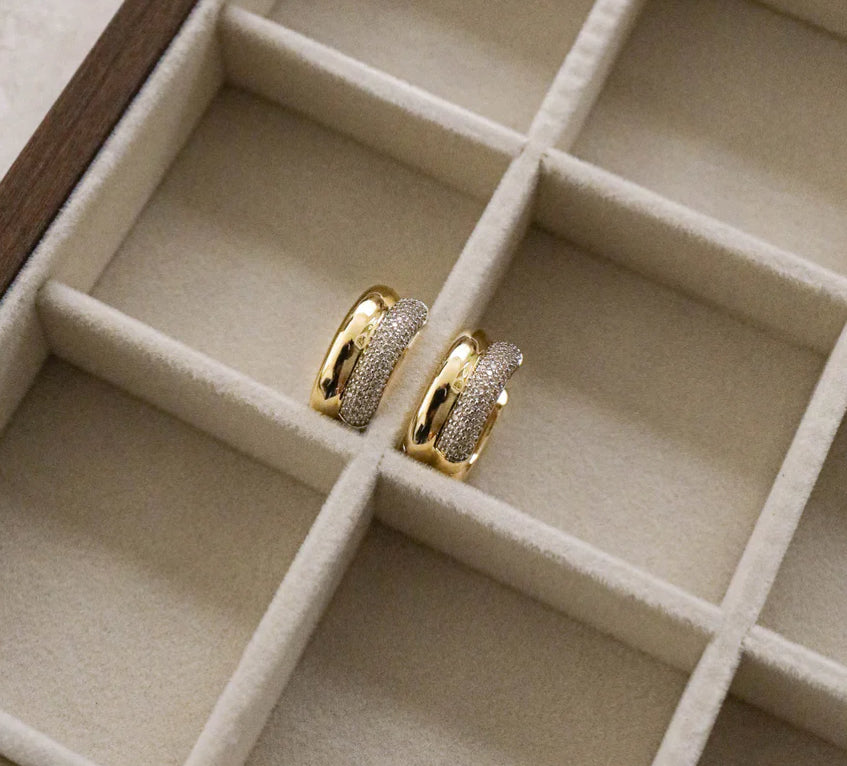 The Tash Earrings by Zahar feature a gold hoop design adorned with a row of hand-set cubic zirconia for a refined touch of shimmer. Classic sparkle, modern edge, perfect for elevating your look.