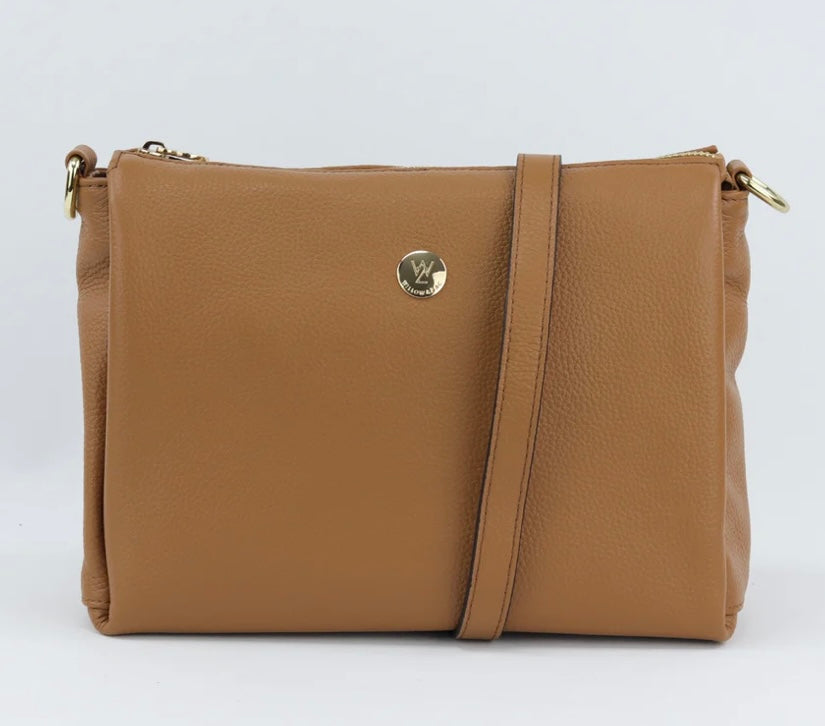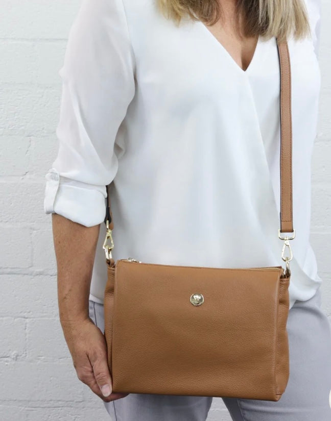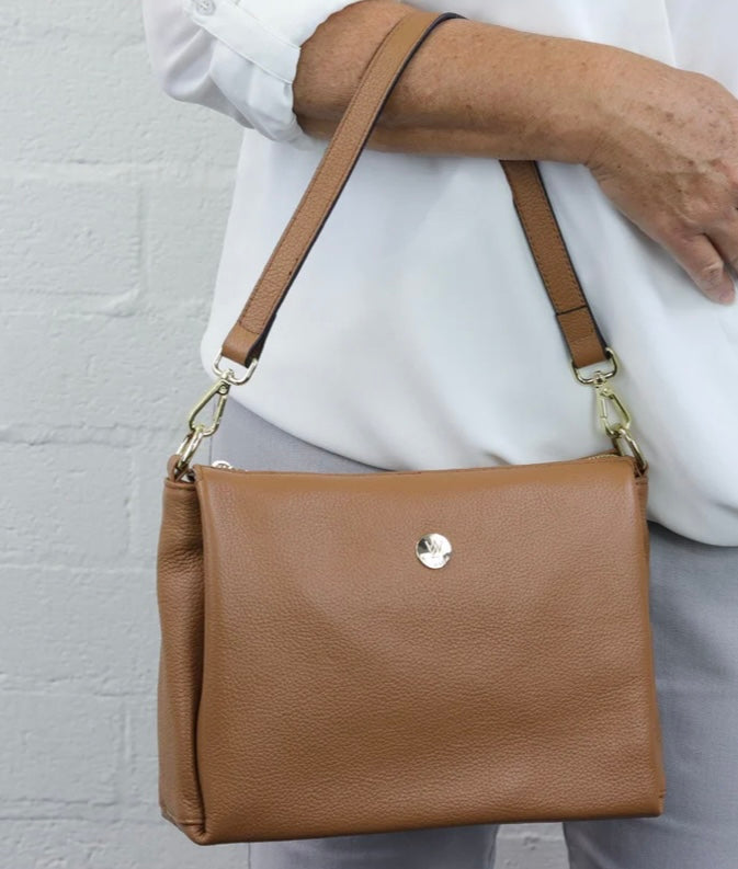 - Adjust the long leather strap (extends 120-128 cm) to cross-body