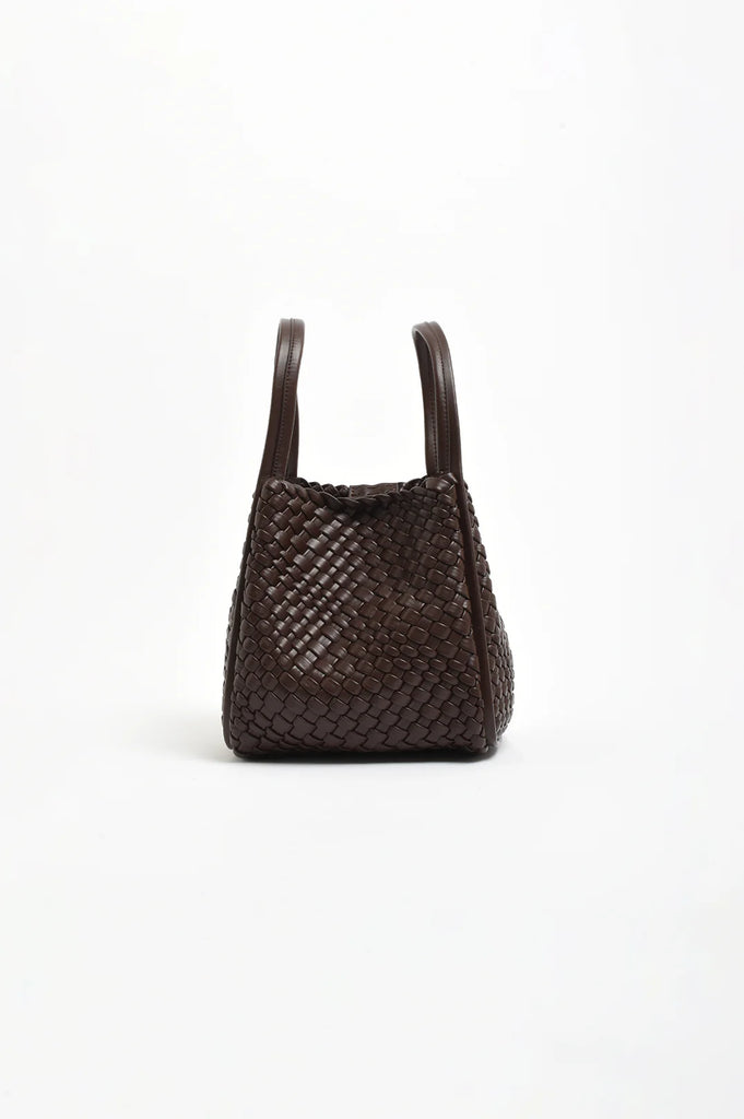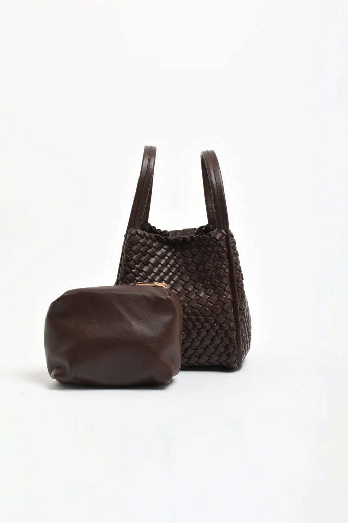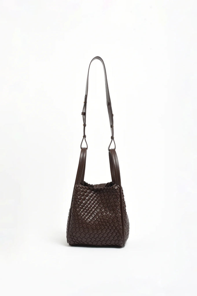 The Woven Slouch Bucket Bag features double handles and a woven vegan leather exterior. Designed with a magnetic clip closure, it includes a removable zip pouch and an optional shoulder strap. Crafted from vegan leather with plated metal hardware.