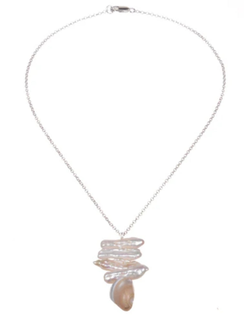 Casual look pendant necklace made from 25mm Keshi Stick Pearls, with polished shell pendant. Comes with a Sterling silver chain and sterling silver parrot clasp.
