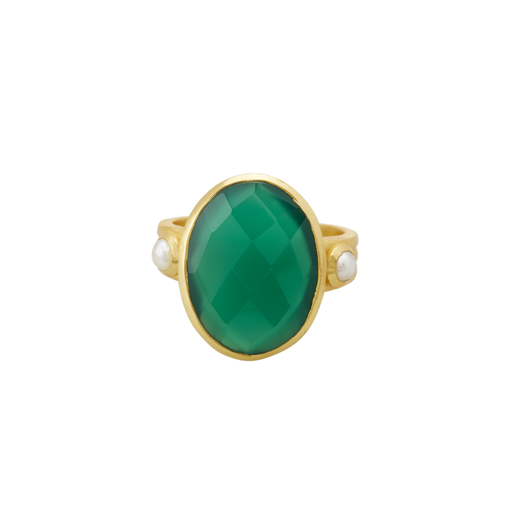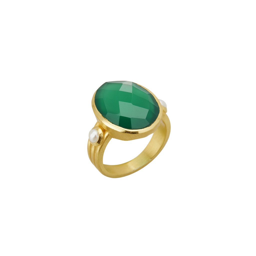 Wandering Soul Green Onyx & Pearl Ring in 18KT Yellow Gold Plate