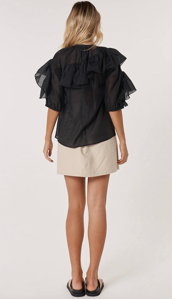 The Celeste Ruffled Blouse exudes effortless femininity. Designed with asymmetrical ruffles, a keyhole neckline and elasticated sleeves, it strikes a balance between structure and softness. Refined and romantic, it transitions seamlessly from day to night.