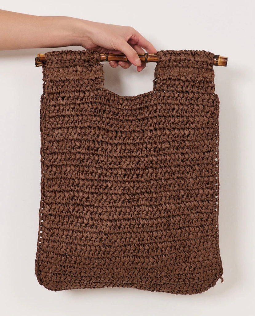 The Paper Weave with Bamboo Handle Tote in Chocolate is crafted from woven raffia with a natural bamboo handle. Designed with an open top for easy carry.